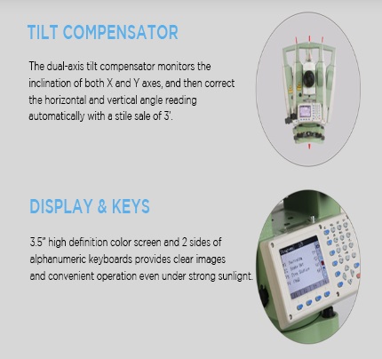 این دستگاه مجهز به سیستم پیشرفته کمپتنساتور دو محوره چهار لایه Dual Axis میباشد. چنانچه دستگاه به هر دلیل در هر یک دو محور X-Y از موقعیت تراز دقیق منحرف گردد، این سیستم میزان خطای مربوطه را به صورت خودکار محاسبه و ضریب متغیر مذکور را در قرائت زوایا اعمال نموده تا در نهایت صحت و دقت زوایا قرائت شوند.