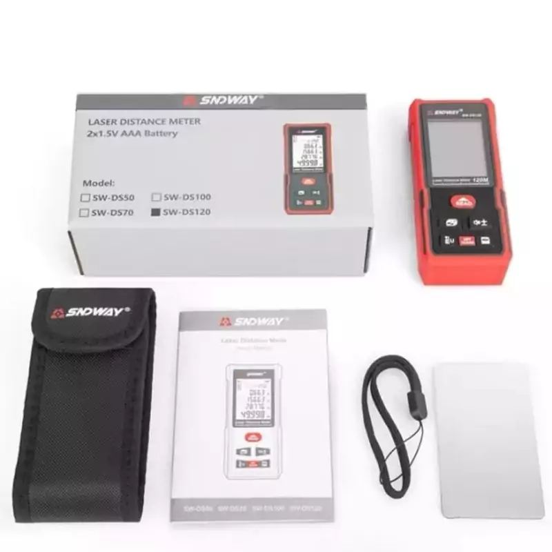 برند سندوی SNDWAY یک برند شناخته شده و خوشنام در تولید ابزارآلات دقیق اندازه گیری و لیزری میباشد. متر لیزری SNDWAY SW-DS100 یکی از جدید ترین محصولات این شرکت می باشد.این متر لیزری با دقت دو میلیمتر دارای کلیه امکانات شامل محاسبه مساحت ، حجم ، فیثاغورث(سه روش مختلف)،تغیر واحد به مییلیمتر،سانتیمتر،فوت و اینچ ،اندازه گیری لایو(ممتد)،اندازه گیری ماکزیمم و مینیمم،صفحه نمایش چهارخطی بزرگ(با چراغ صفحه)،اندازه گیری زاویه(شیب سنج دیجیتالی)،قابلیت ذخیره 30 اندازه گیره(حافظه) و مصرف کم باتری(8000 بار اندازه گیری) و قابلیت خاموش شدن اتوماتیک چراغ صفحه ، نور لیزر(20 ثانیه) و خود دستگاه(150 ثانیه) میباشد.همچنین این متر ضد رطوبت و ضد گرد و غبار میباشد و دارای استاندارد CE و RoHS(استاندارد اتحادیه اروپا)و استاندارد FCC(استاندارد قاره آمریکا)میباشد.